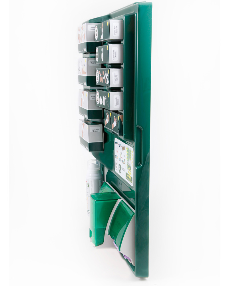 Första hjälpen-tavla. En komplett och mycket prisvärd Första Hjälpen-station, här finns allt lättillgängligt på plats vid en olycka.