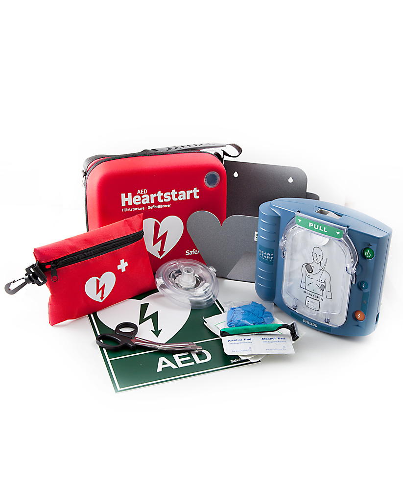 Ett komplett paket med hjärtstartare och alla tillbehör som behövs. Paketet innehåller: – Philips hjärtstartare HS1 – Väska – Väggfäste i snygg metall – SA-delux – Första hjälpen kit med pocketmask – Skylt – 8 års garanti